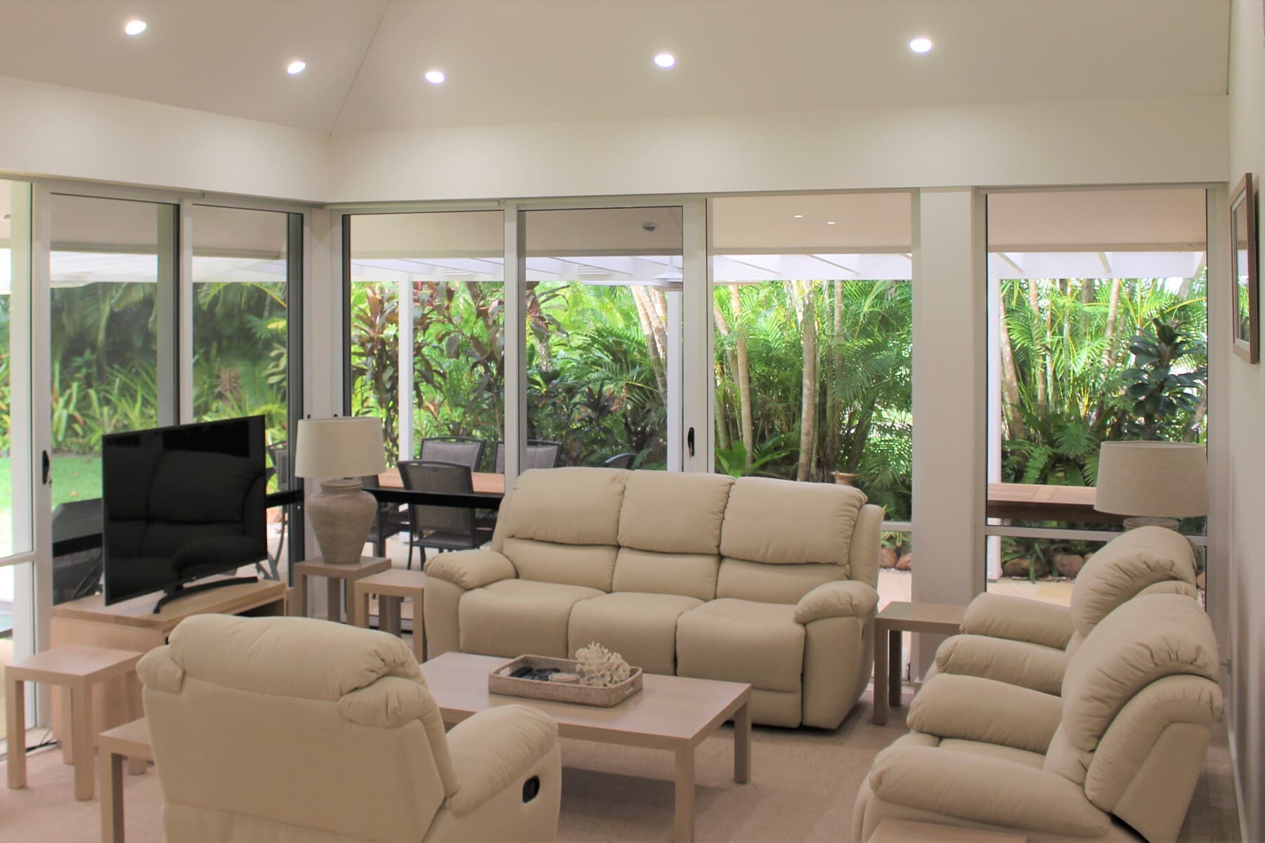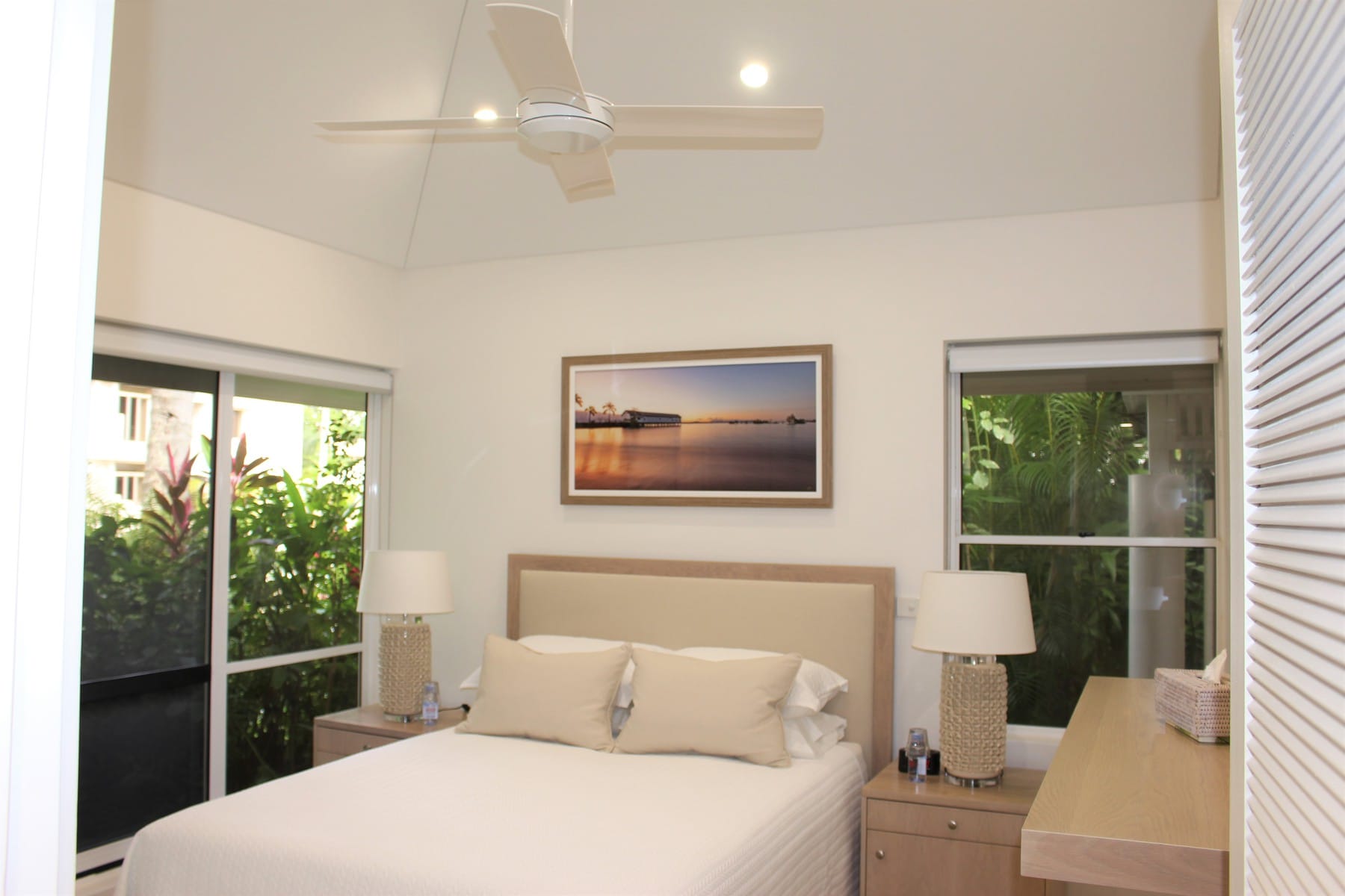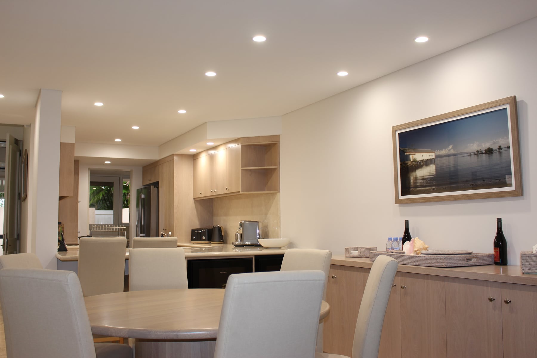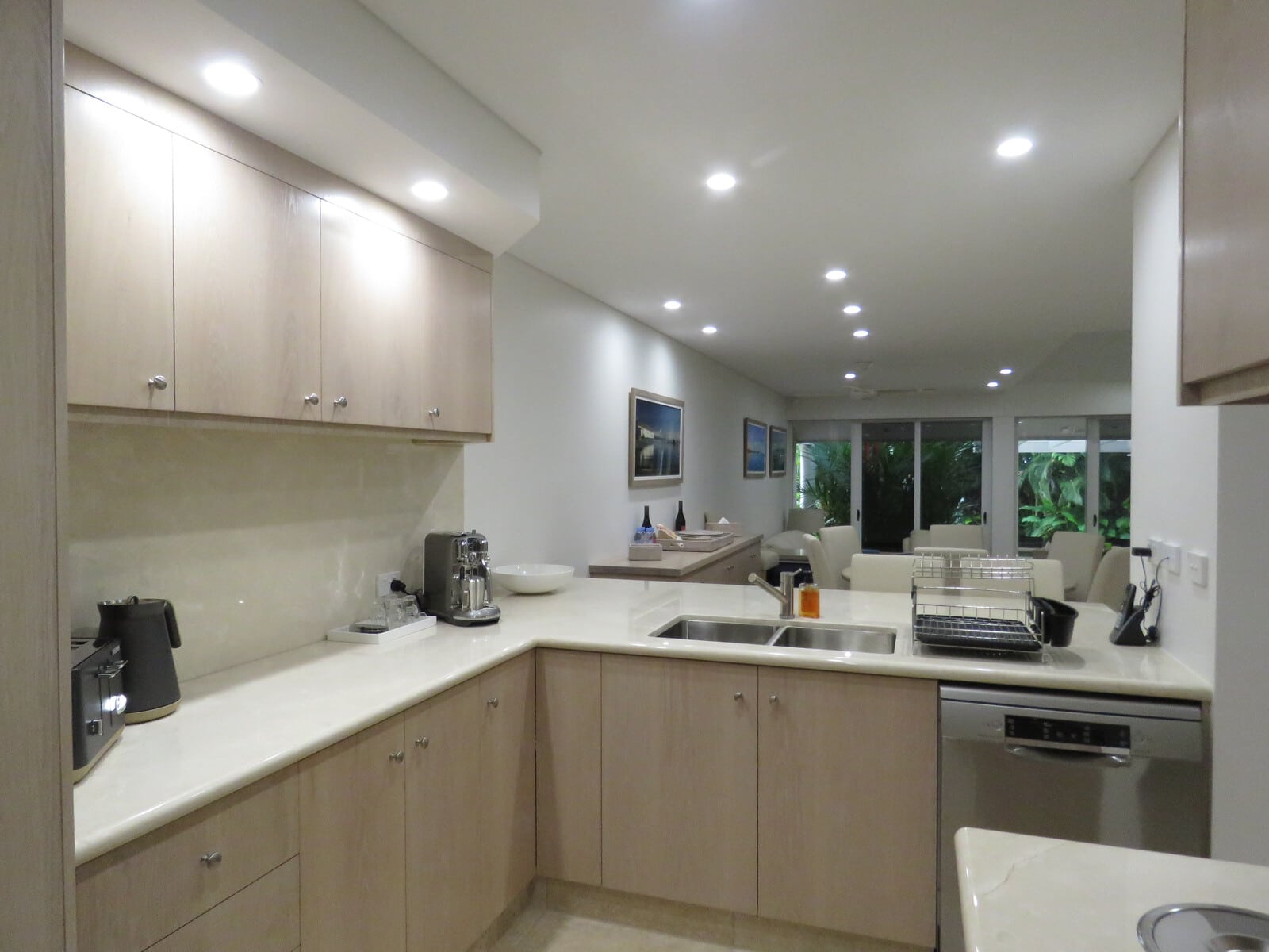 Dolphin Electrical has completed a number of small and large villa renovations at Sheraton Mirage Port Douglas. Here are the photos of our most recent renovation project that included replacing all lights and fans throughout the property. We worked with the team at M&R Kitchens to replace the entire kitchen and all three bathrooms were renovated. New power points and light switches have been installed and all electrical has been brought up to AS3000 Australian Standards of safety.